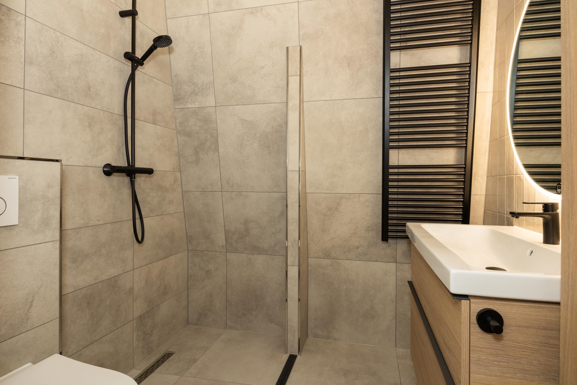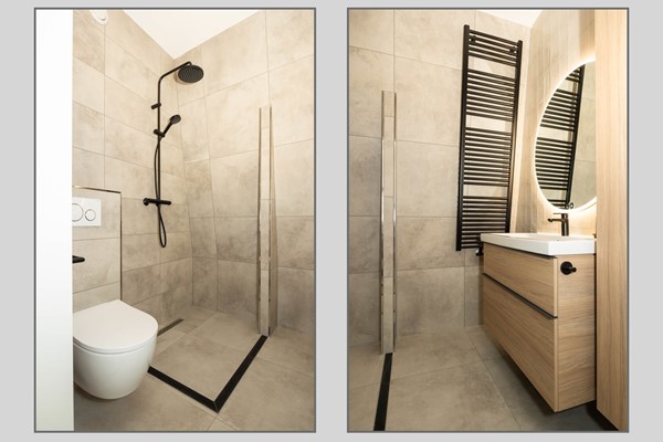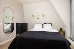 The bathroom is also located on this floor and features a walk-in shower, toilet, and a stylish wood-look vanity unit. At the rear of the same floor is the bedroom, which is furnished with a wardrobe and a double bed. Via the stairs in the private hallway, you reach the roof terrace, which is shared with the occupant of apartment 47D.