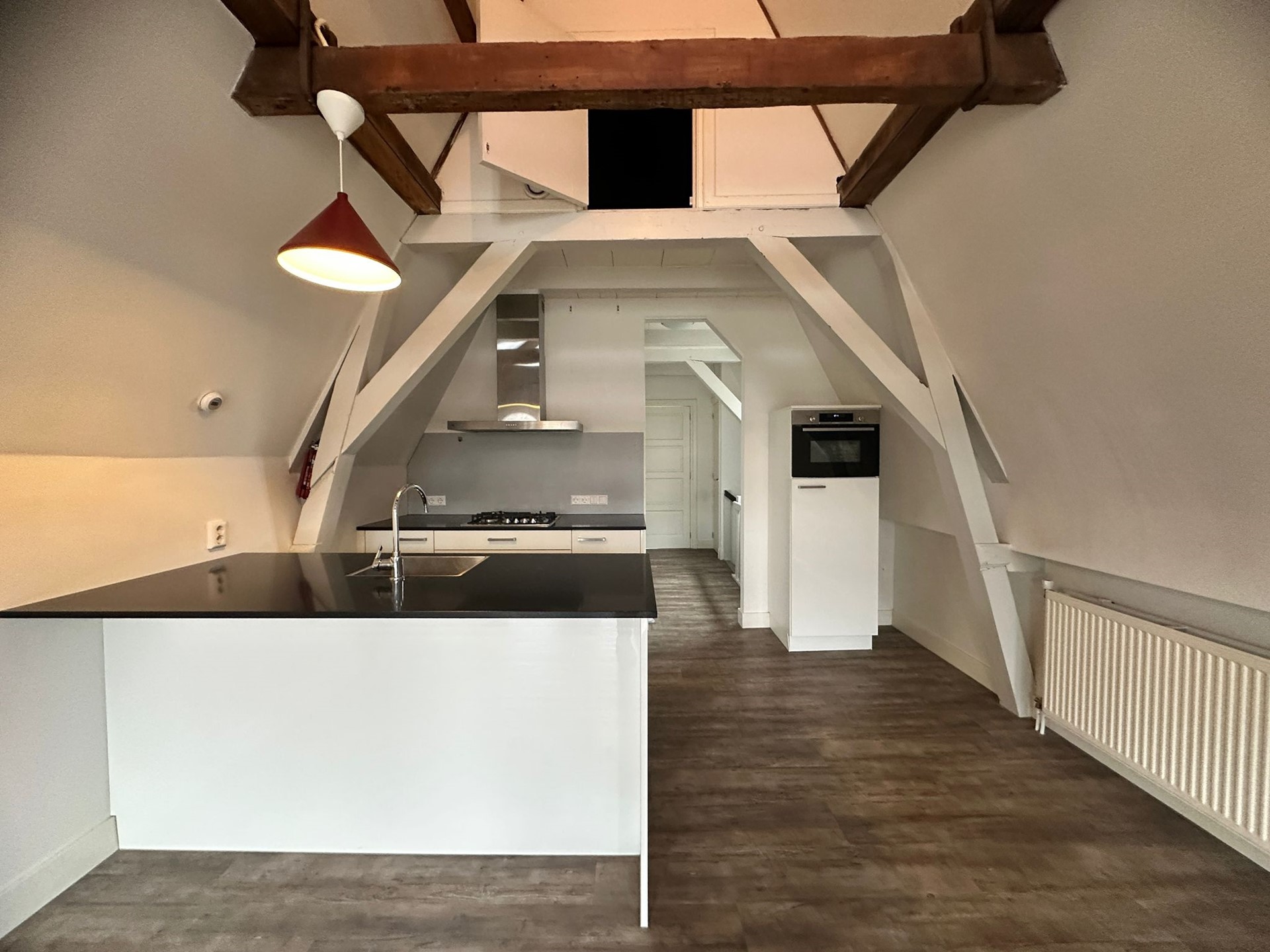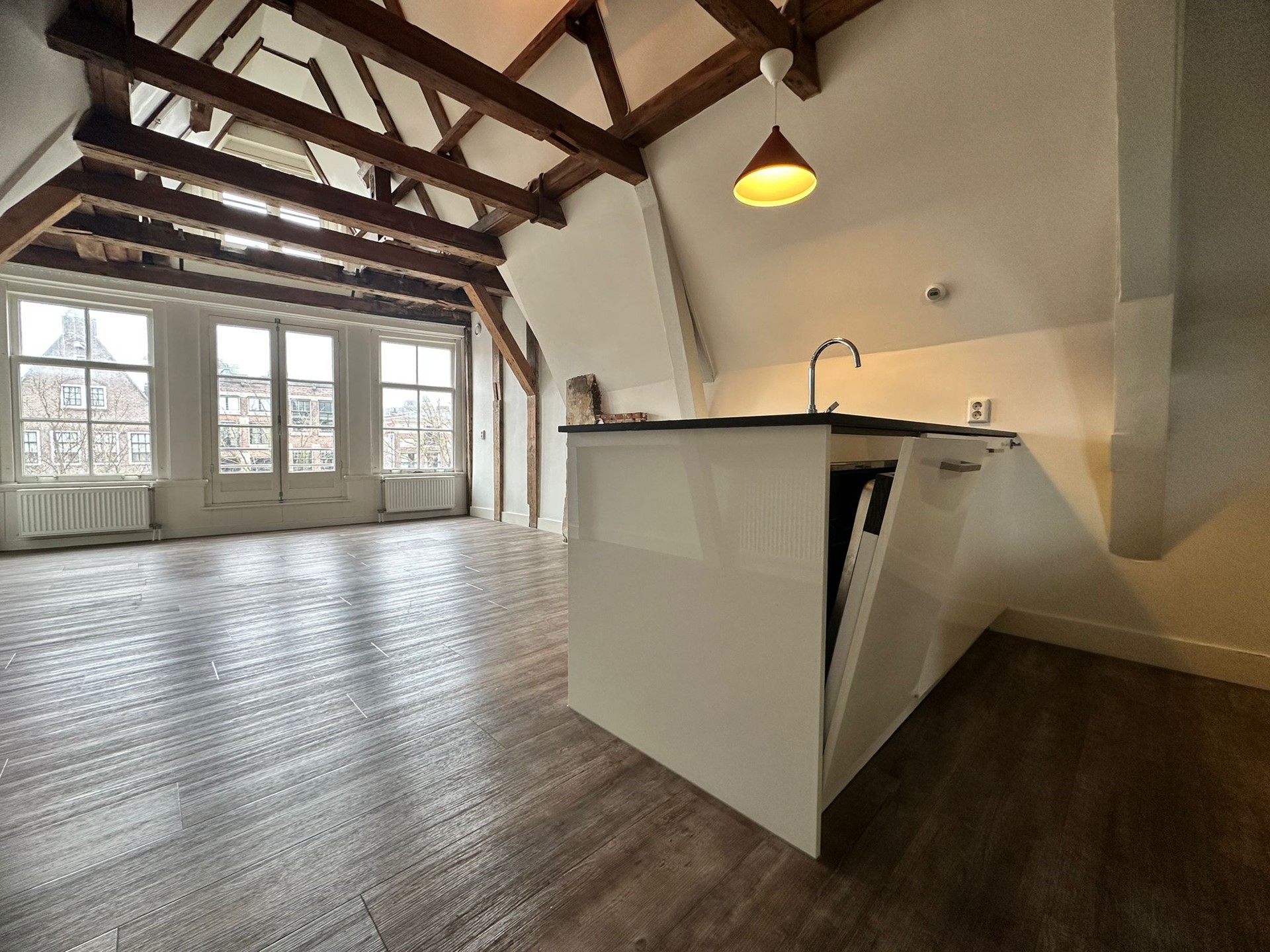 De woonkamer bevindt zich aan de voorzijde (grachtzijde) van het pand en kenmerkt zich door hoge plafonds en prachtige monumentale balken die direct sfeer geven. De grote ramen zorgen voor veel lichtinval en bieden uitzicht op de historische omgeving. De pvc vloer met houtlook maakt het geheel warm en modern.