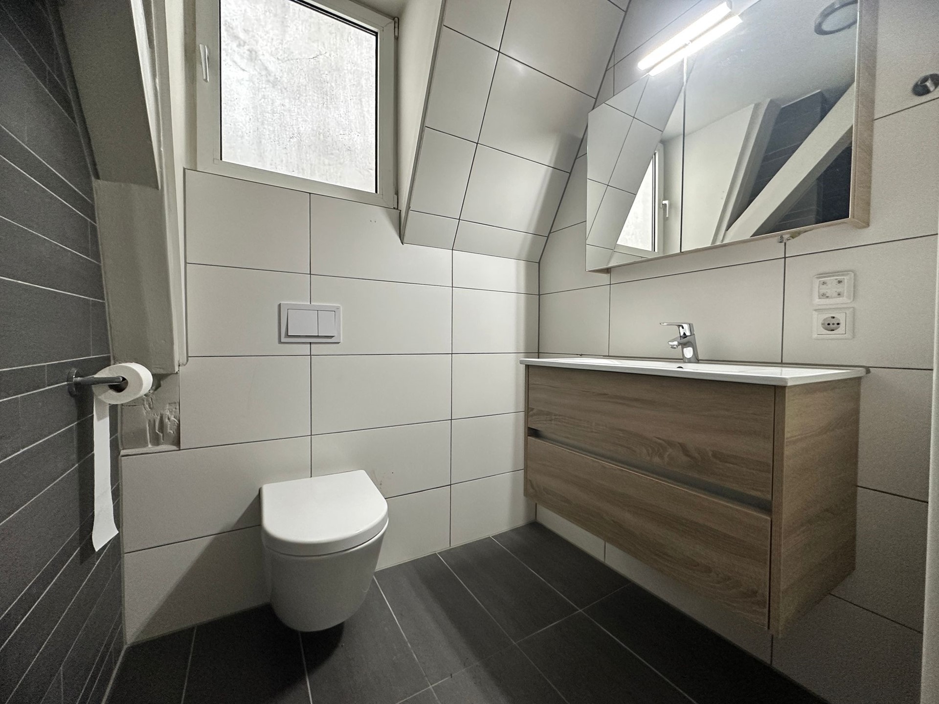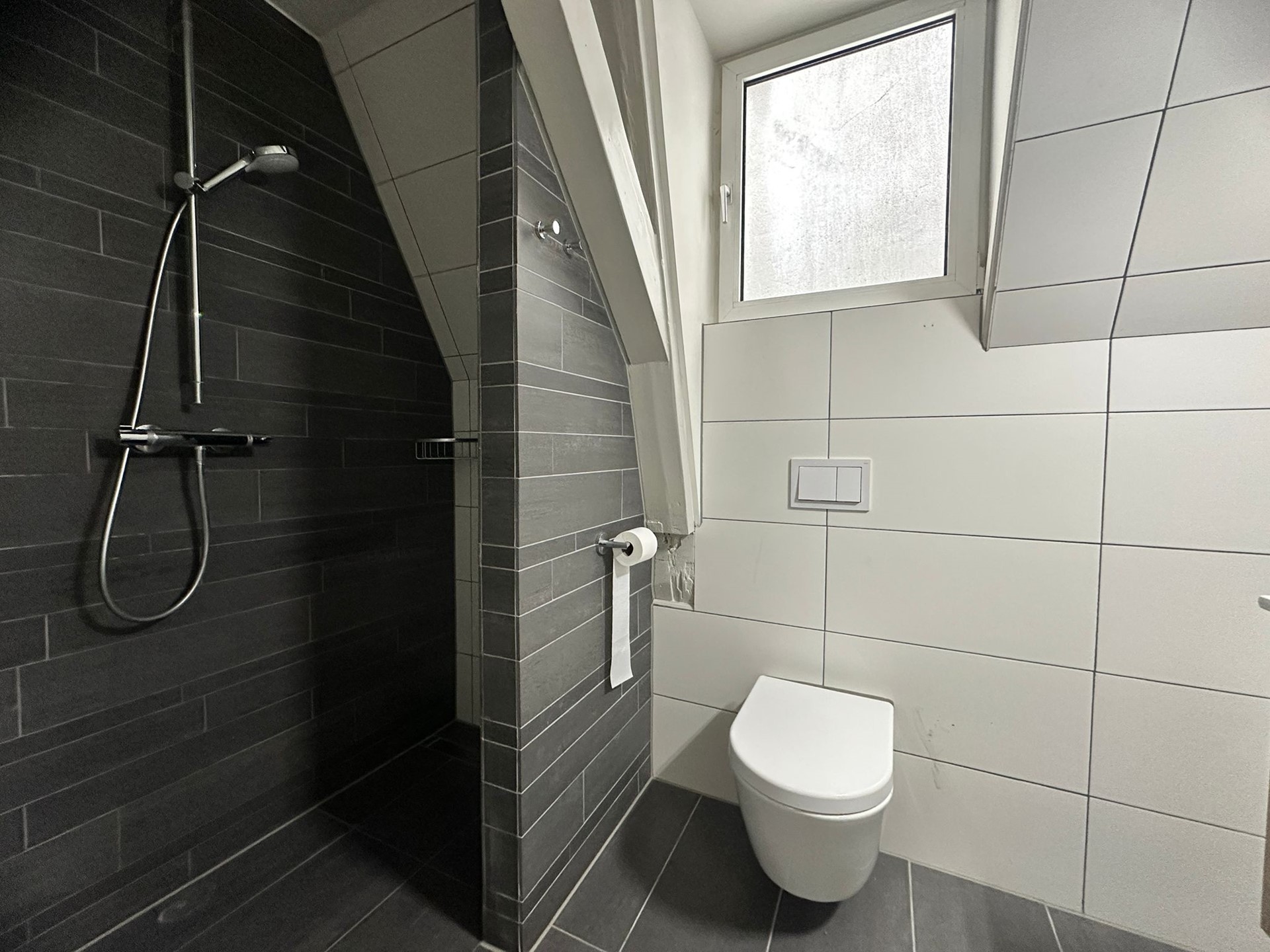 De badkamer is modern afgewerkt en voorzien van een douche, wastafel en toilet. Daarnaast is er een separate ruimte met aansluiting voor de wasmachine.
