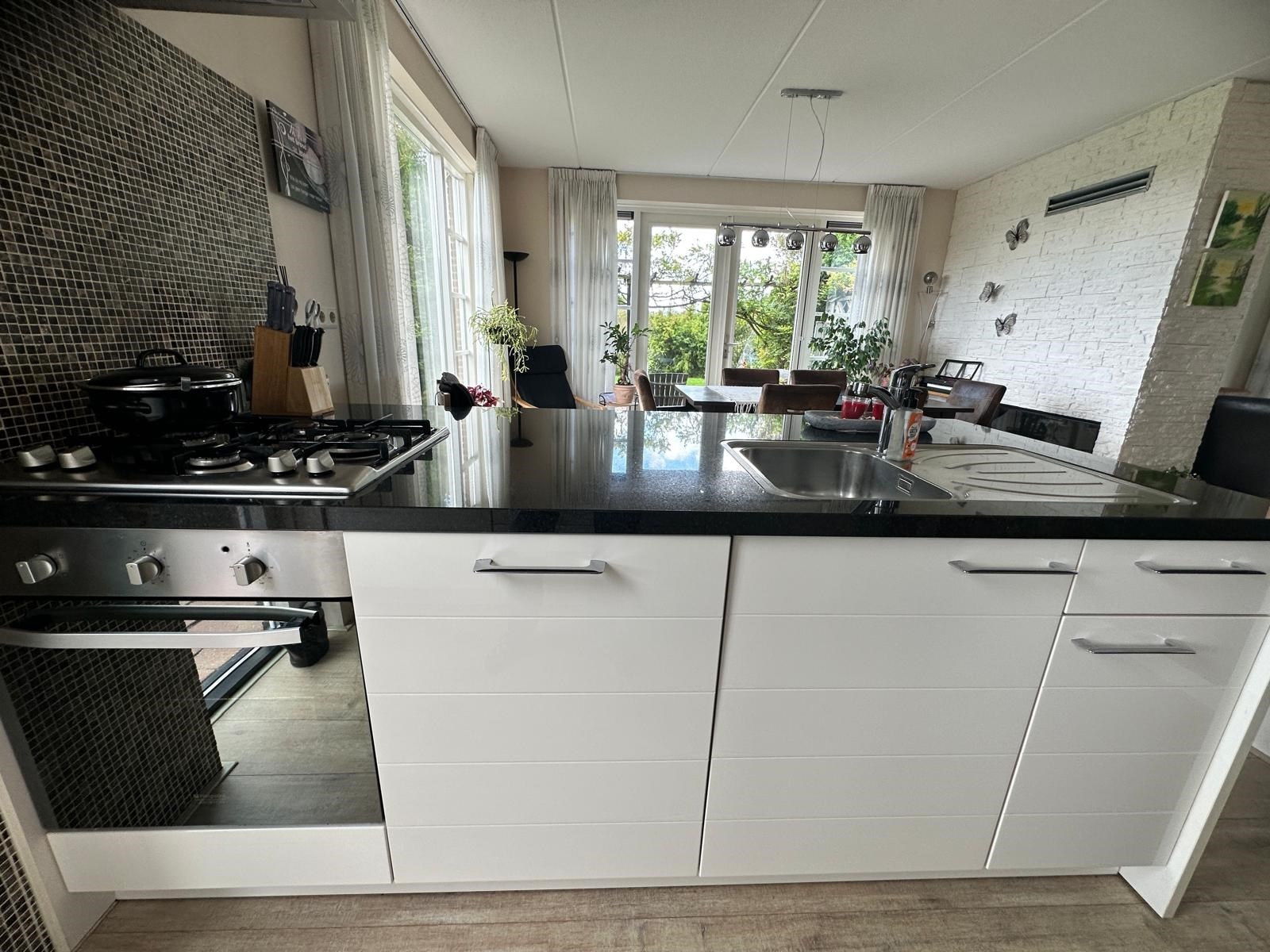 Via de hal stap je binnen in deze comfortabele woning. Hier vind je ook het gastentoilet. Vanuit de hal kom je in de ruime woonkamer met halfopen moderne keuken en kookeiland. De keuken is volledig uitgerust en voorzien van alle gemakken: vaatwasser, oven, magnetron, grote koelkast en vriezer. Aan de eettafel geniet je van een prachtig uitzicht over de tuin.