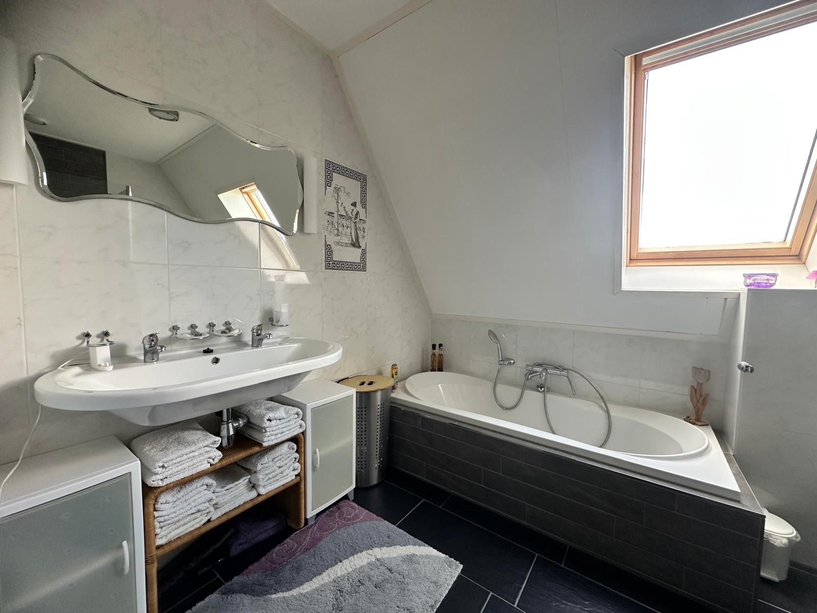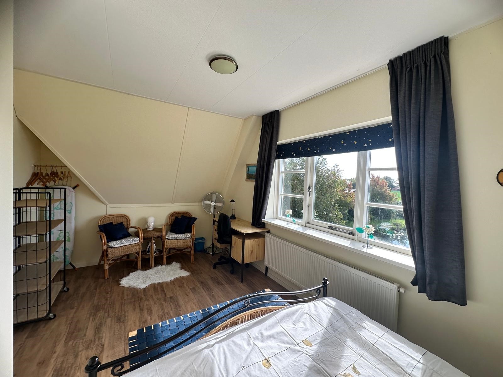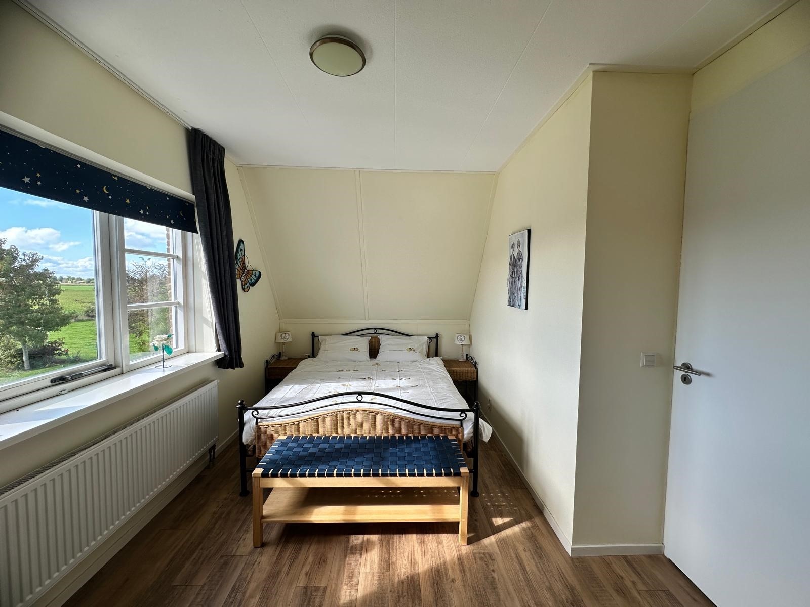 Op de eerste etage bevinden zich twee ruime slaapkamers. De masterbedroom beschikt over een tweepersoonsbed en bureau. De tweede slaapkamer heeft twee eenpersoonsbedden en biedt daarnaast ruimte voor een ledikant. De moderne badkamer is voorzien van een extra toilet, ligbad, aparte douche en wastafel. Handdoeken drogen vanzelf aan de radiator. Kortom: een comfortabele woning met luxe voorzieningen, ideaal voor zowel ontspanning als werken vanuit huis. En het uitzicht? Dat verveelt nooit!