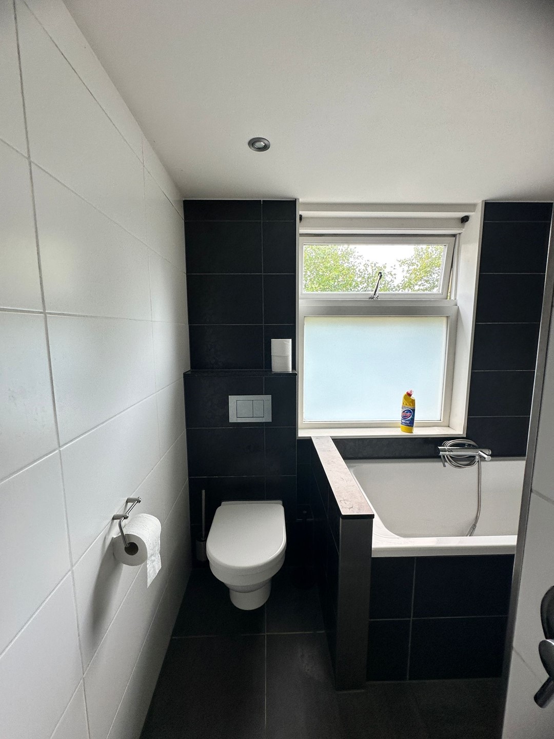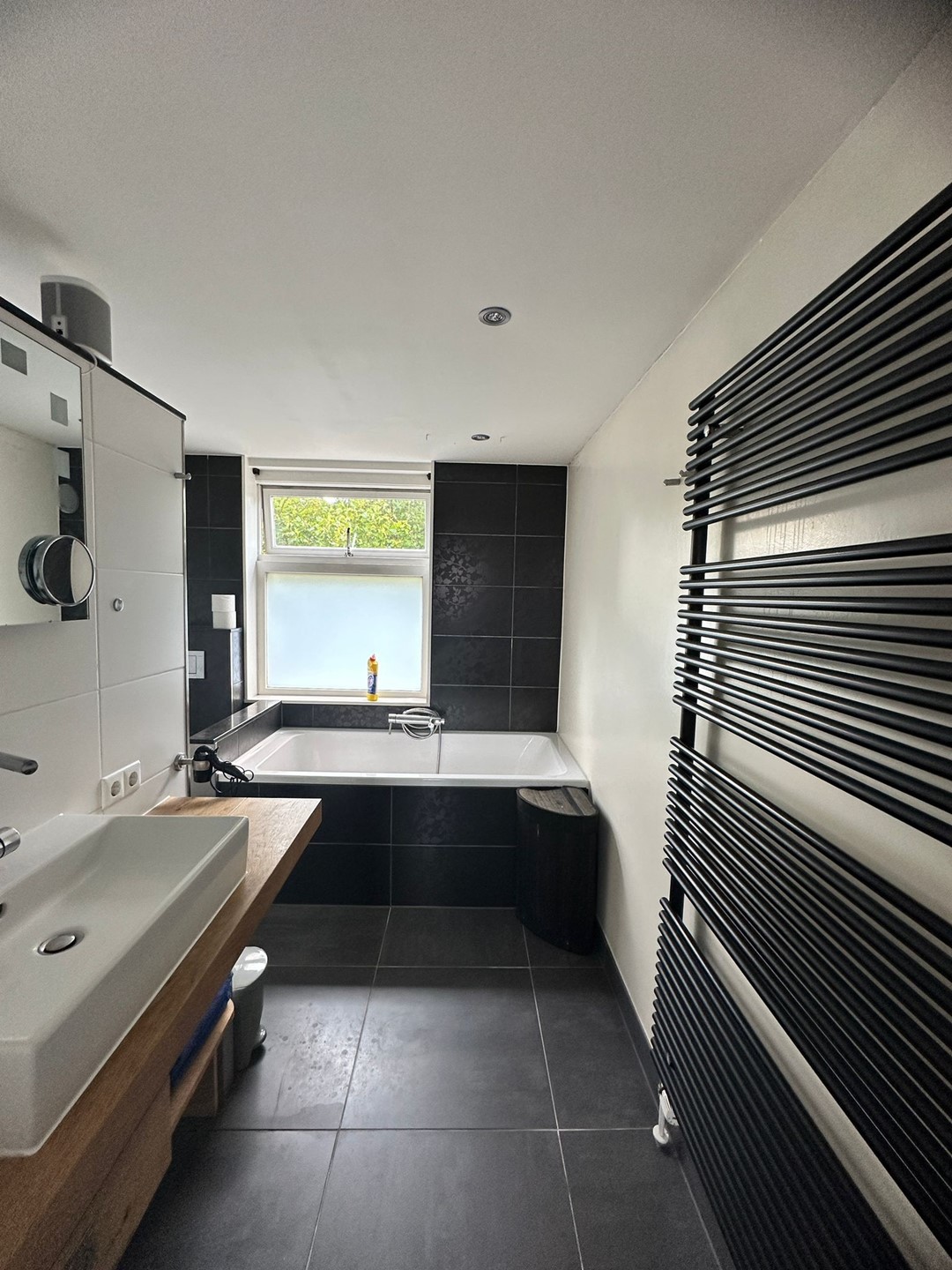 De badkamer is volledig betegeld en uitgerust met een aparte douche, heerlijk ligbad brede wastafel en 2e toilet.