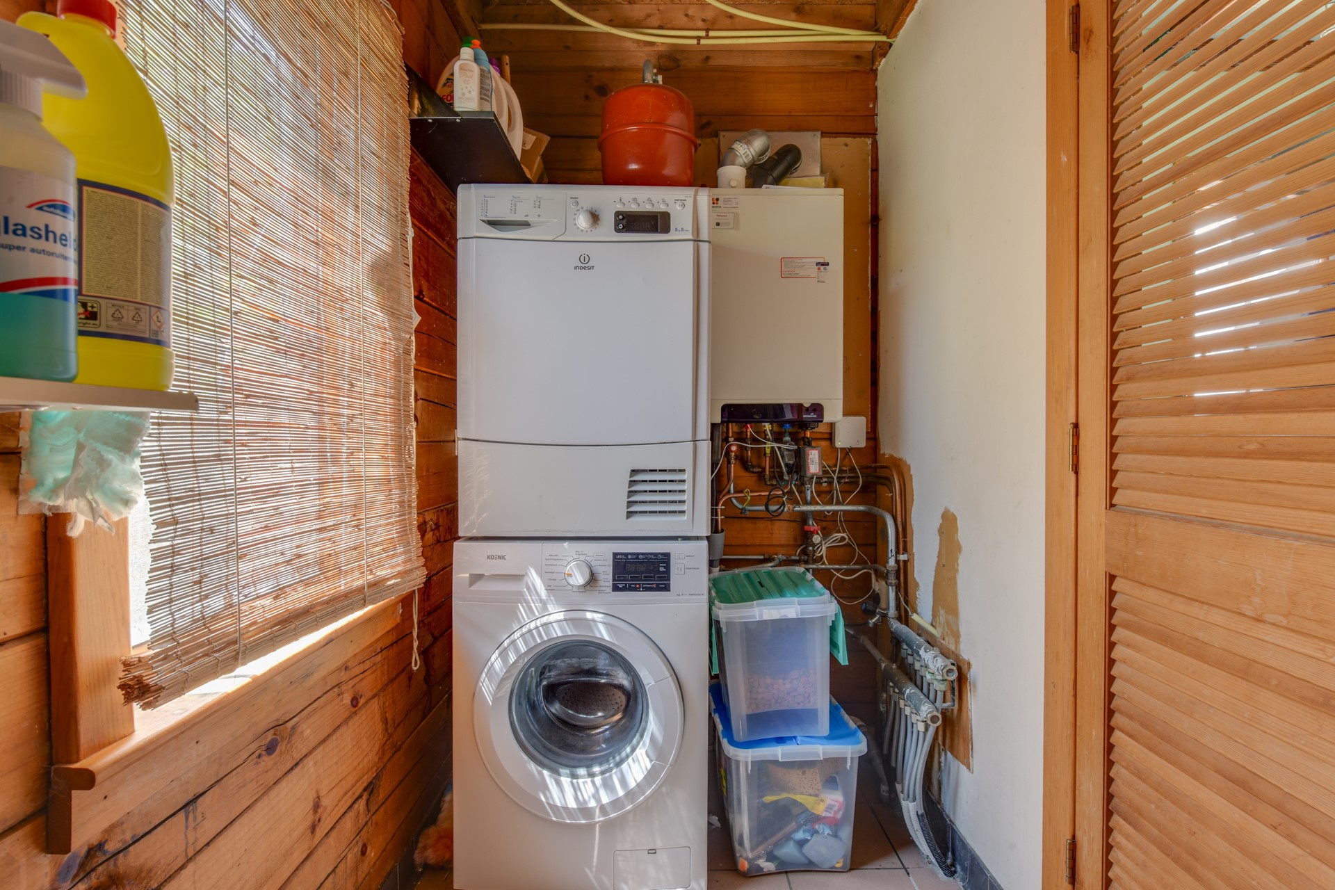 Aan de voorzijde bevinden zich twee eigen parkeerplaatsen en een inpandige garage met elektrische roldeur. Via de entree bereikt u de lichte hal met toegang tot de woonkamer. De royale living heeft een hoog plafond, grote ramen en openslaande deuren naar de zonnige tuin. De open keuken is compleet uitgerust met o.a. vaatwasser, kookplaat, koelkast, vriezer, oven en magnetron. Aansluitend vindt u een praktische bijkeuken met wasmachineaansluiting.