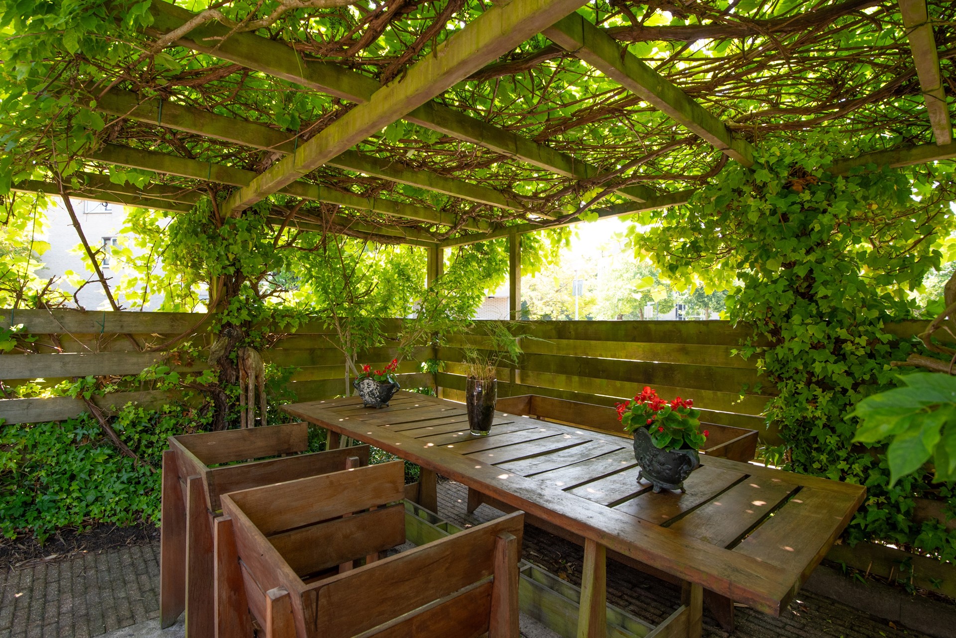 De woning beschikt over een ruime, zonnige tuin op het zuiden, rondom de woning gelegen. Hier is volop gelegenheid om te loungen, borrelen of dineren. Er is tevens een houten berging en een sfeervolle veranda in Amerikaanse stijl.