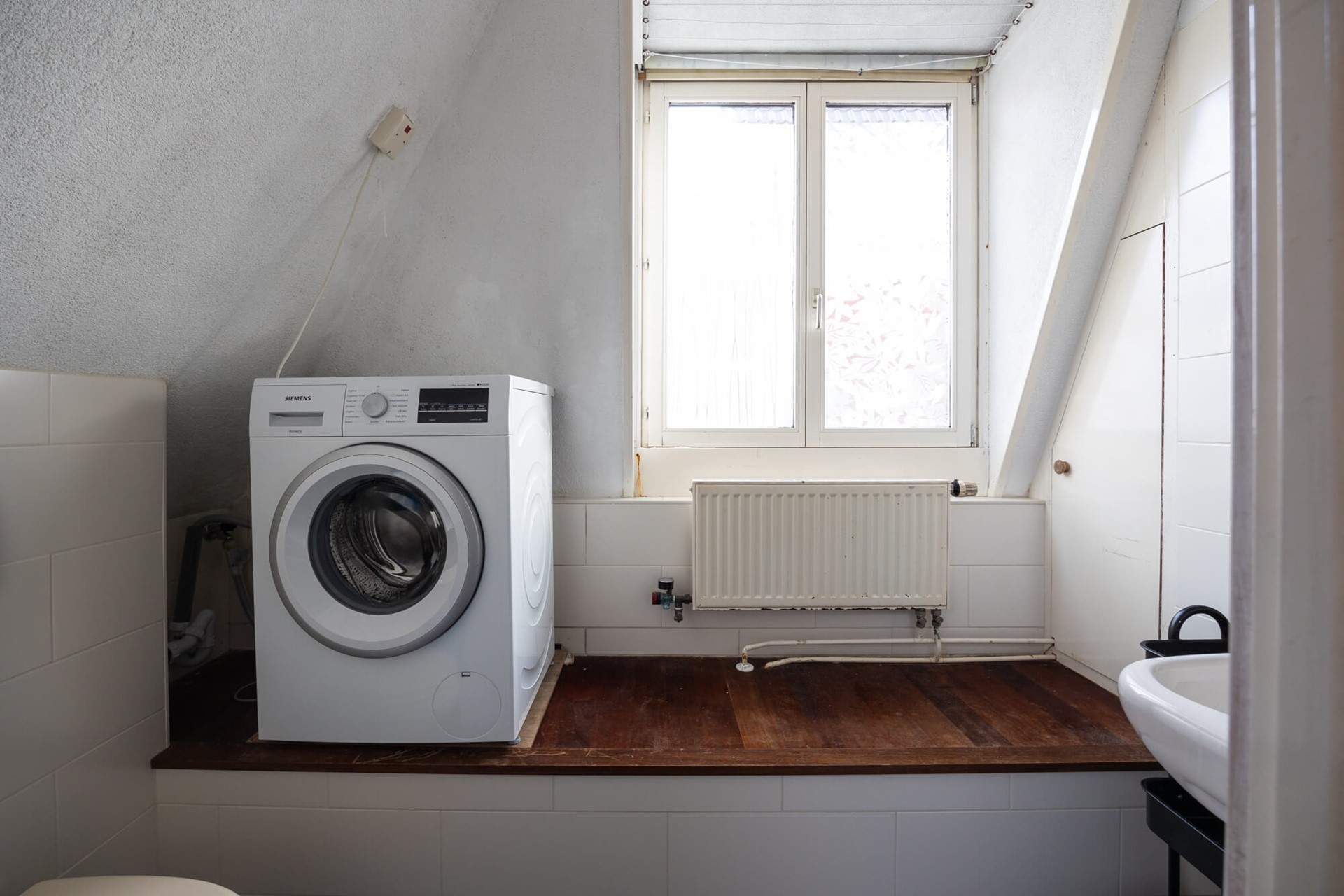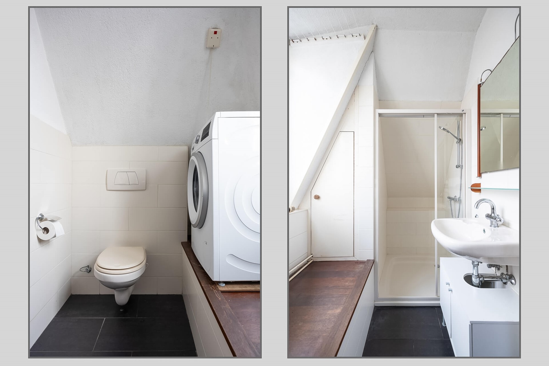 De badkamer is voorzien van een inloopdouche, heeft een wastafel met spiegel en er is een tweede toilet. De badkamerwanden zijn voorzien van wit tegelwerk, de vloer heeft een donkergrijze tegel. Verder is hier de opstelling van de wasmachine en droger en op het wasrek kan je tevens je was drogen.
