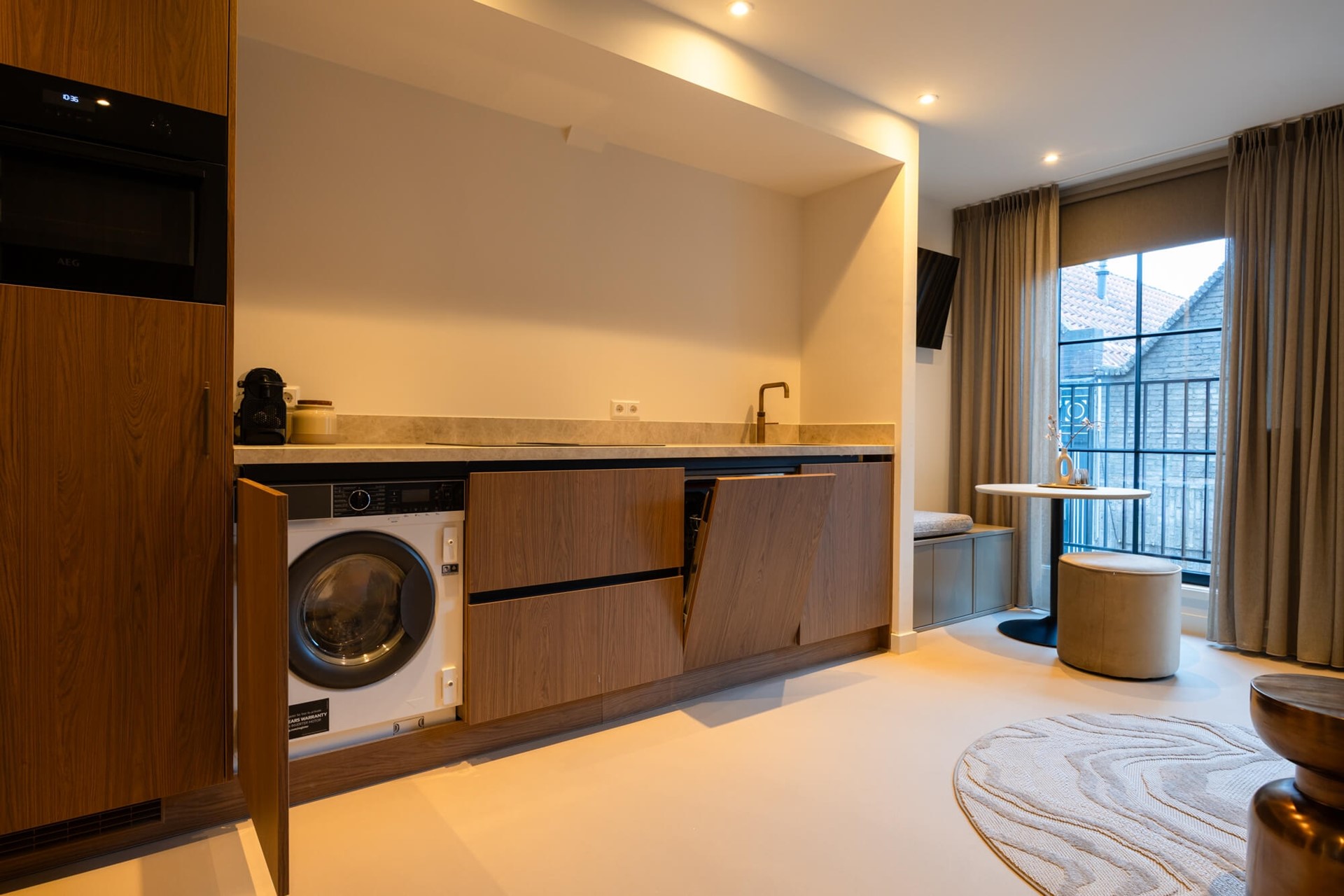 Aan de zijkant van de studio is de keuken slim geplaatst, met een rechte opstelling en bovenkasten voor extra opbergruimte. De keuken is van alle gemakken voorzien en sluit naadloos aan bij de moderne uitstraling van de studio.