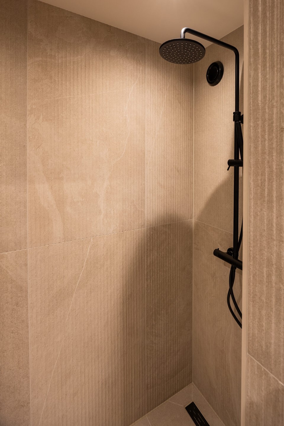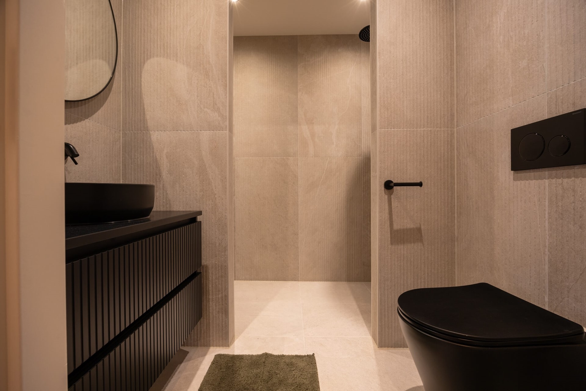 De badkamer is separaat. Deze is uitgerust met een douche, toilet en wastafel, uitgevoerd in een strakke en frisse stijl. Daarnaast is er in de hal ruimte voor een garderobe of extra kastruimte.