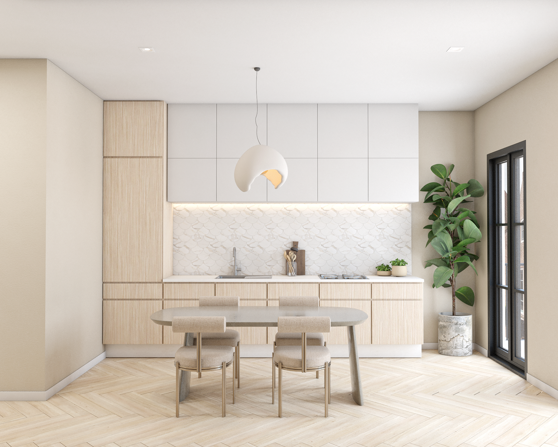 Je komt binnen via de centrale hal, waar ook de trapopgang zit. Vanuit hier stap je de lichte woonkamer binnen, met grote ramen aan de achterzijde die uitkijken op de omgeving en zorgen voor veel daglicht. De woonkamer biedt voldoende ruimte voor een zithoek en een kleine eettafel.