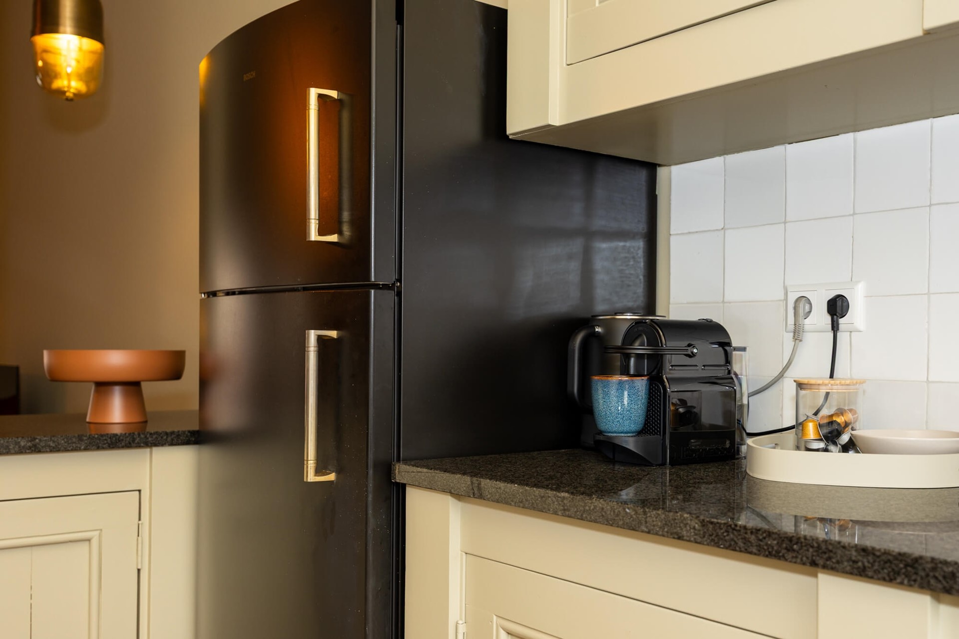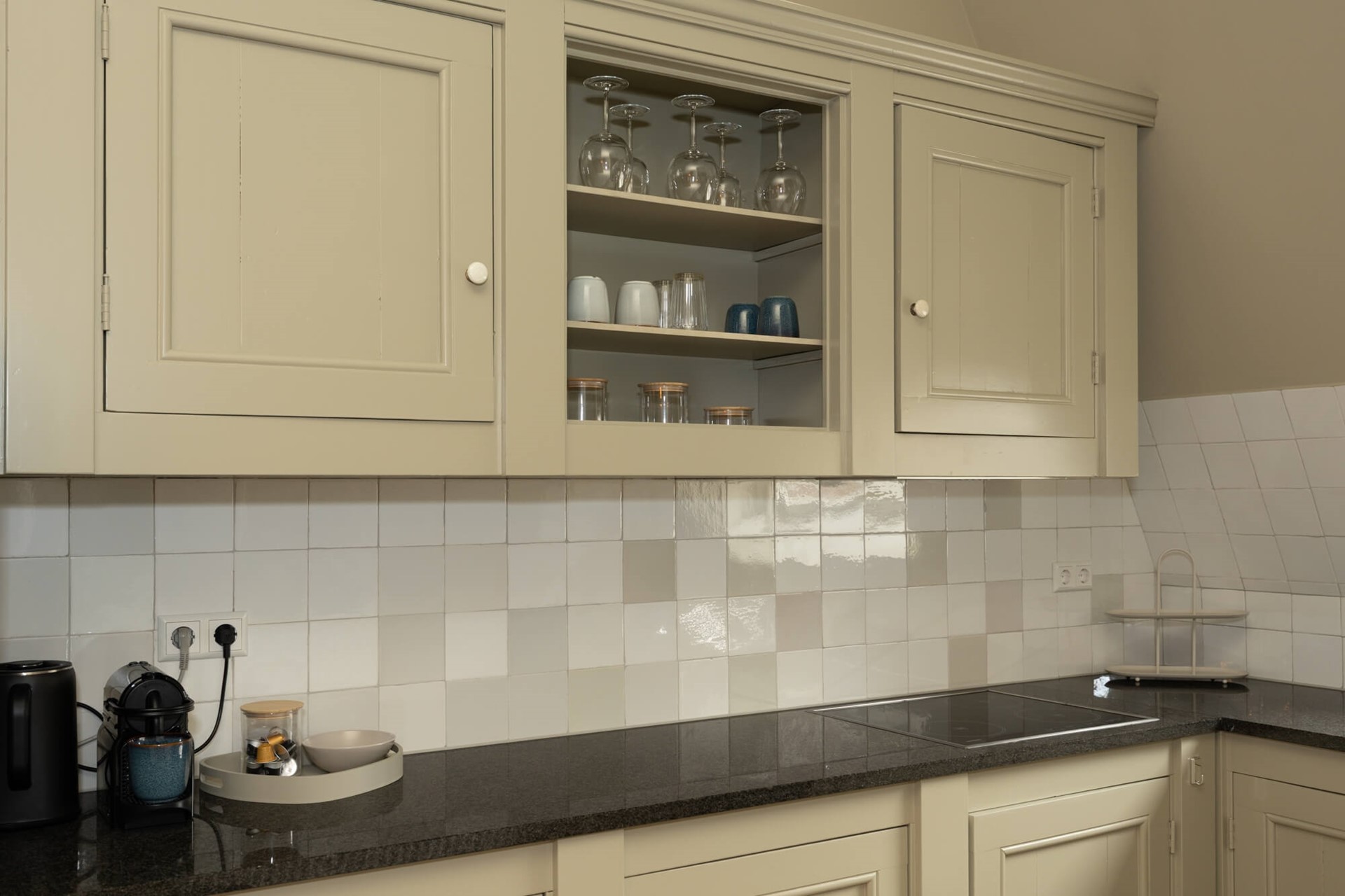 In de modern ingerichte U-keuken – mét stenen blad – kook je gegarandeerd de sterren van de hemel. Alles wat je wenst is aanwezig: een koel-/vriescombinatie, 4-pits inductiekookplaat en een vaatwasser. Ook praktisch: veel werkruimte en kastjes om je eigen keukengadgets in op te bergen.