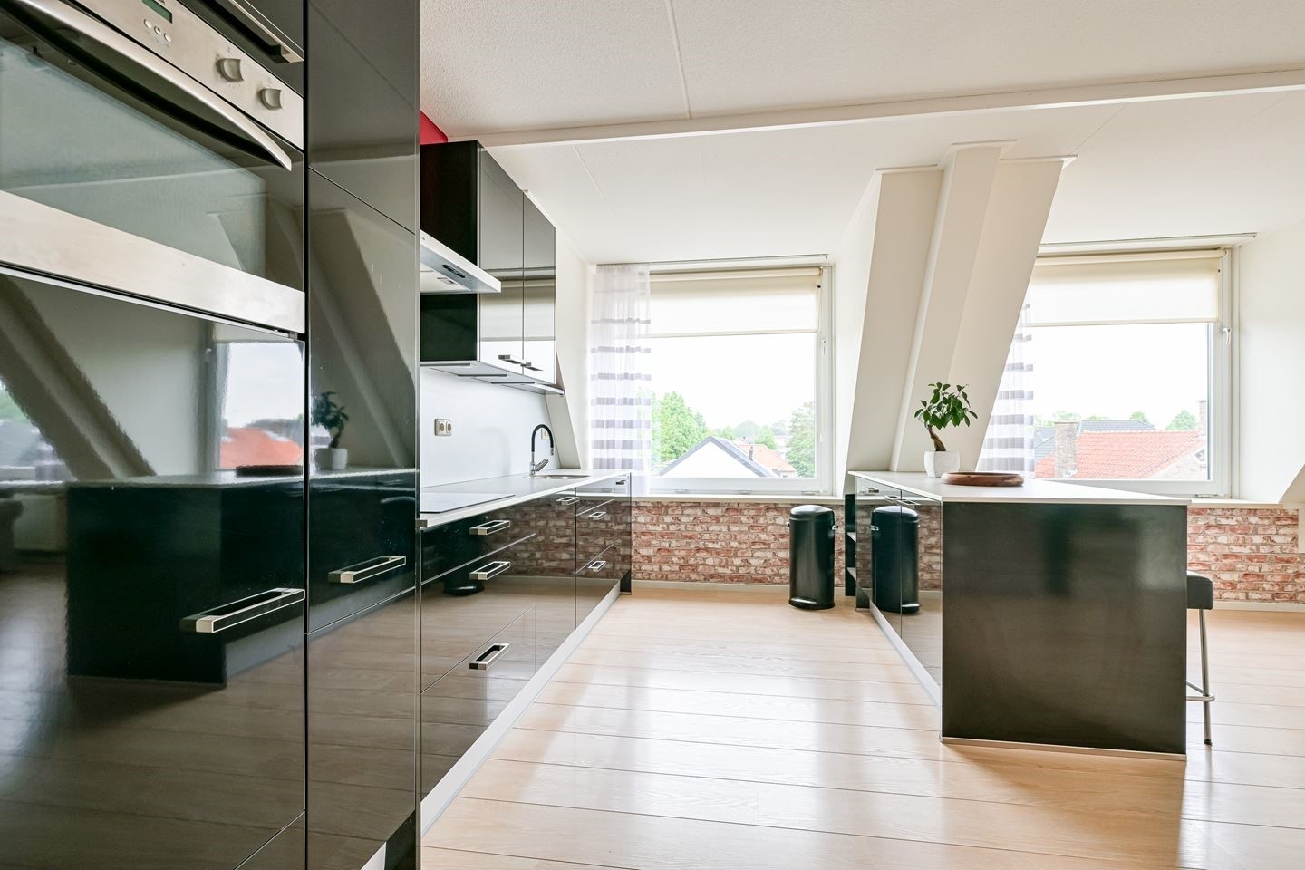 De ruime woonkamer is afgewerkt met een echte houten vloer en strak gestuukte wanden. Dankzij de hoge ramen is er veel lichtinval. De open keuken is functioneel ingericht en voorzien van een keramische kookplaat, afzuigkap en voldoende kast- en bergruimte.