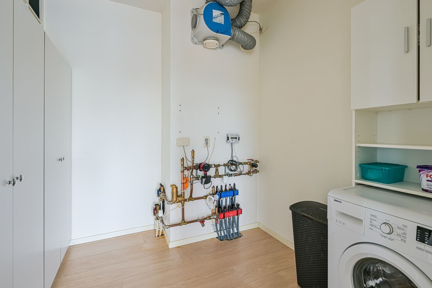 De hal geeft toegang tot de meterkast en een praktische wasruimte met aansluitingen voor wasmachine en droger.